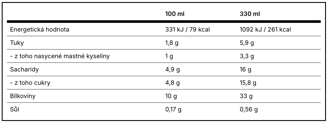 Mléko 89 %, mléčná bílkovina 8 %, inulin, kakaový prášek 1 %, sladidlo: steviol‑glykosidy ze stévie, enzym laktáza.