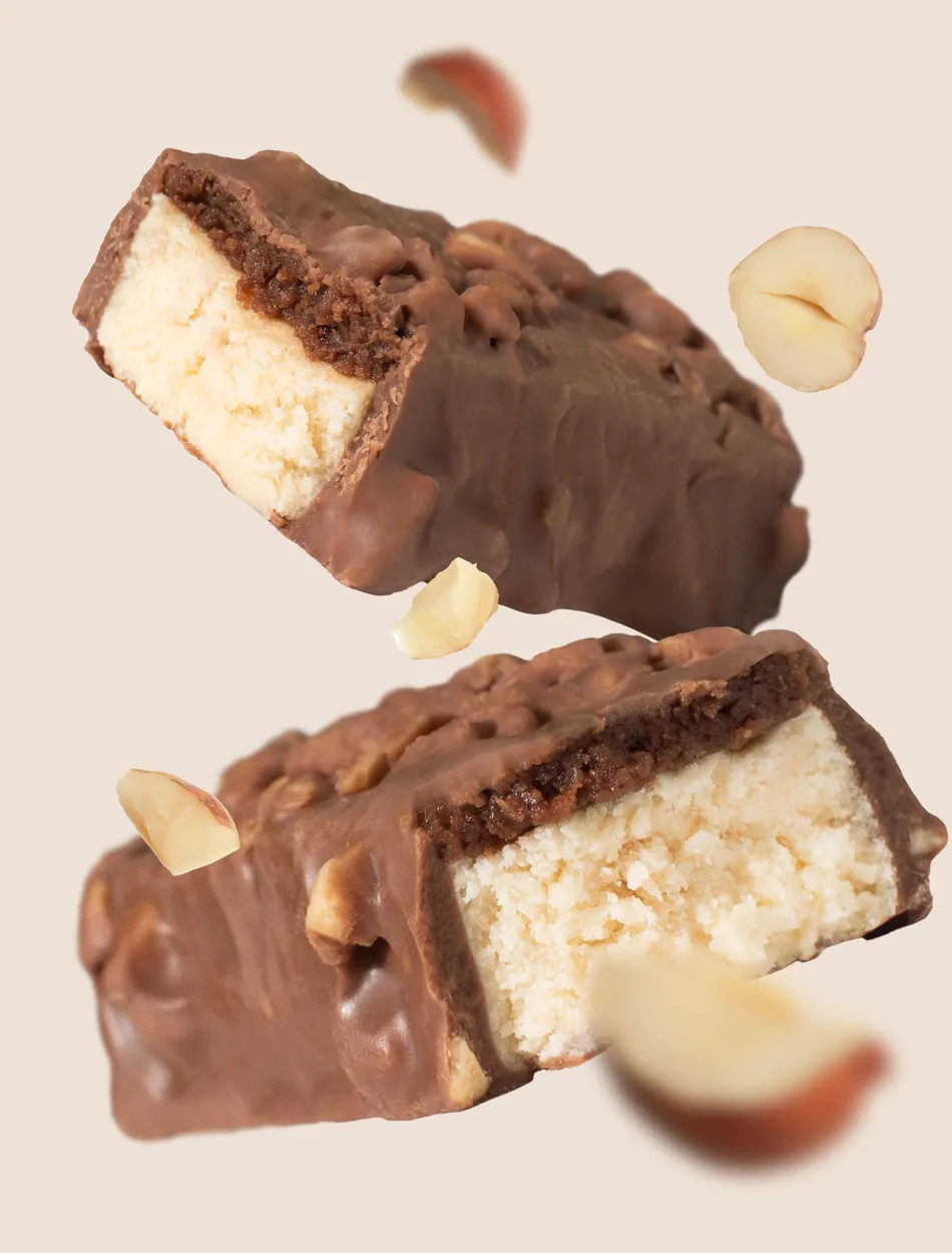 Ultrafiltrovaný mléčný protein 19 %, vláknina z řepy, lískové ořechy 11 %, hydrolyzovaný kolagen (hovězí), kakaové máslo, zvlhčující látka: glycerol, kakaová hmota, sušené mléko, hrachový proteinový izolát 3 %, kakaový prášek, kokosový olej, cukr, bramborový škrob, med, vanilkový extrakt, emulgátor: lecitin*, přírodní aroma, sladidlo: steviol‑glykosidy ze stévie.